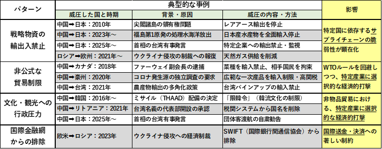 近年、経済的威圧は国内法や行政手続き、あるいは市場力学や国民感情などを装って、巧妙になりつつあり、いくつかのパターンがある(下図表参照)。なお、2023年にEUは中国を念頭に置いて、経済的威圧に対する対抗措置を制定できる「反威圧手段(ACI)規則」を採択した。